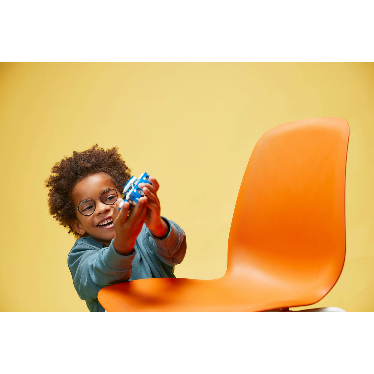 •    Ce e în cutie? – vei găsi tot ce îți trebuie pentru a construi o mașină de jucărie cu loc în cabină în spatele roții pentru minifigurina polițist inclusă.